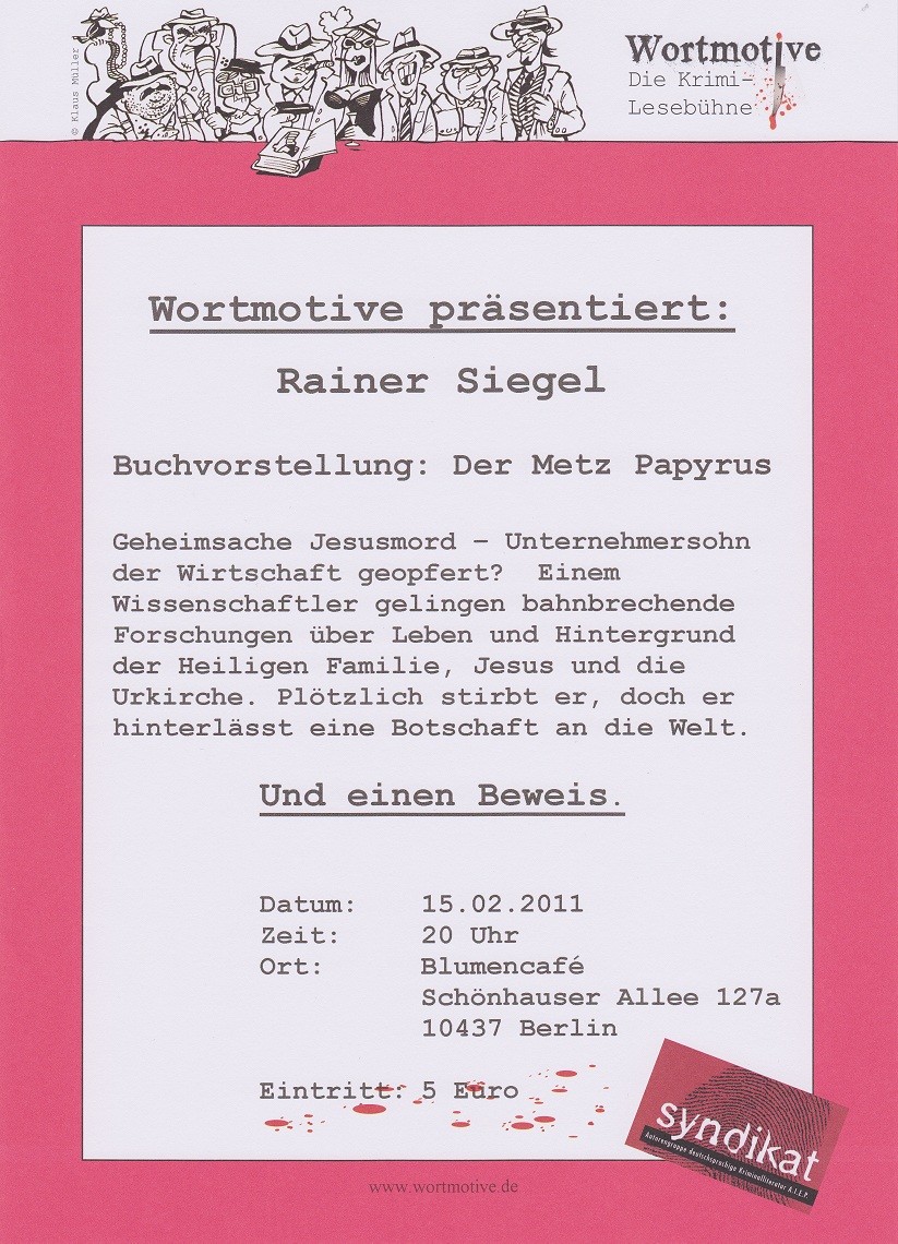 Auf Vermittlung der Berliner Agentur Stephan Hähnel liest Rainer Siegel am 15.02.2011 im Blumencafé in Berlin. Im Rahmen der "Krimilesebühne Wortmotive" wird Rainer Siegel Highlights aus seinem Religionsthriller "Der Metz Papyrus" präsentieren. Freuen Sie sich auf einen spannenden Lesungsabend der neueste Forschung zum Tode Jesu in eine spannende Krimihandlung verwebt.